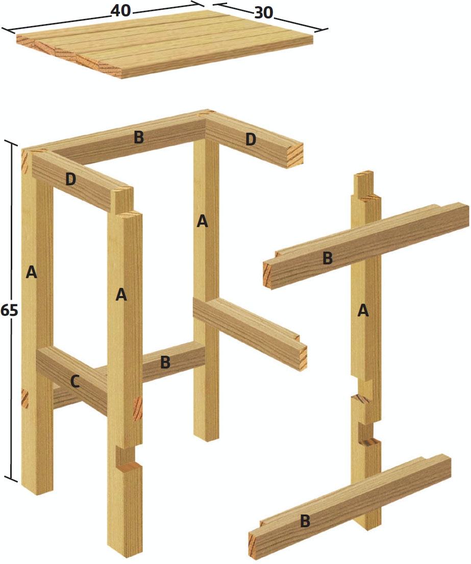 Sidene monteres med trelim og skrutvinger. Det er kun én skrueskjøt øverst, der beina settes fast til listestykket (D) under setet. Sjekk ofte med vinkelen.