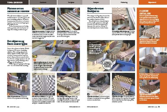 Nå er alle stavene skåret ut, og vi står med 42 trestaver - 21 i lønn og 21 i valnøtt i forskjellige tykkelser. Nå skal de limes sammen til to plater i et bestemt mønster, som du kan se på tegningene på foregående side.