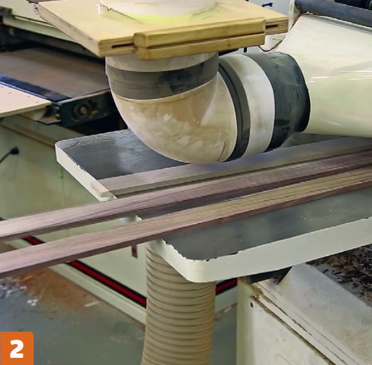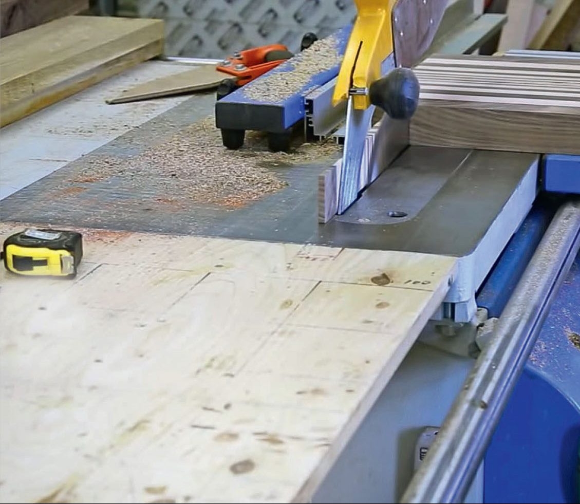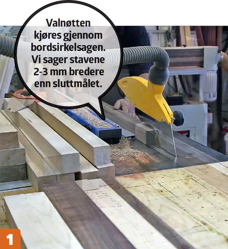 Sørg for å sage stavene i en tykkelse som er 2-3 mm bredere enn det som er angitt på tegningen. Vi bruker en bord-sirkelsag og en båndsag til å skjære til stavene. En sirkelsag kan også brukes.