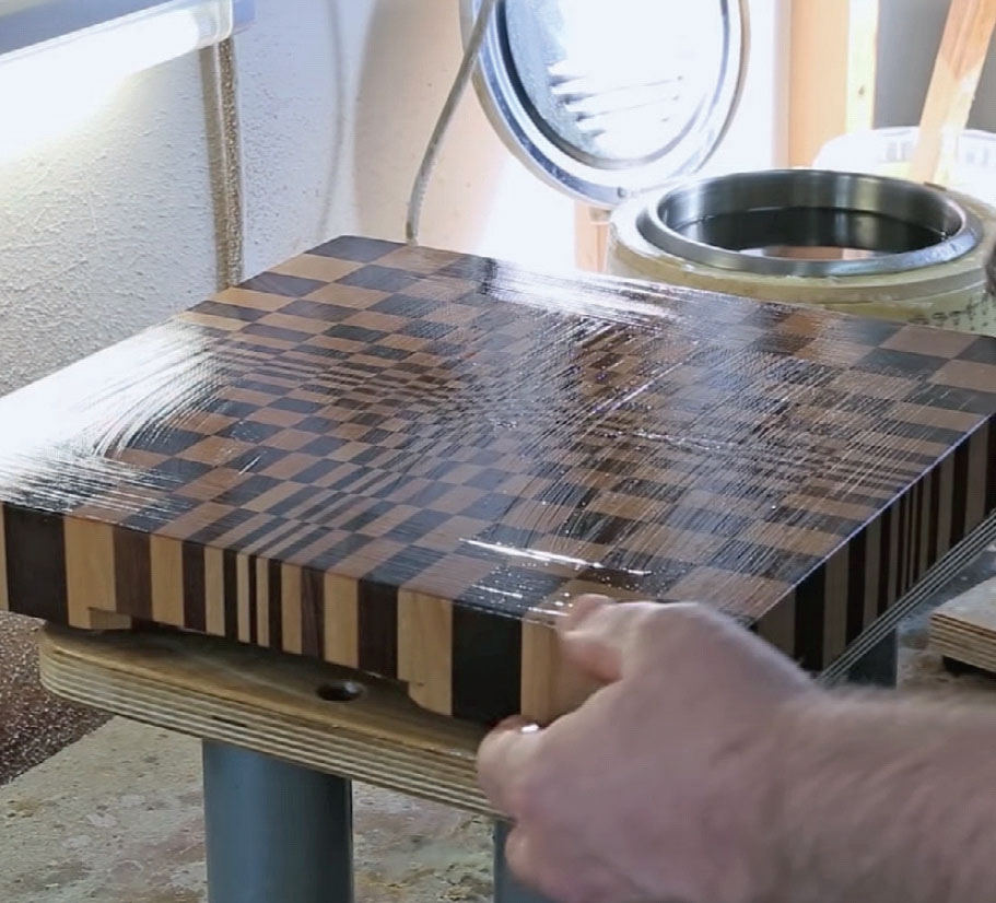 Brettet vokses. Vi bruker en 1:1-blanding av olje og bivoks. Skjærebrettet får to lag med en lett mellomsliping.