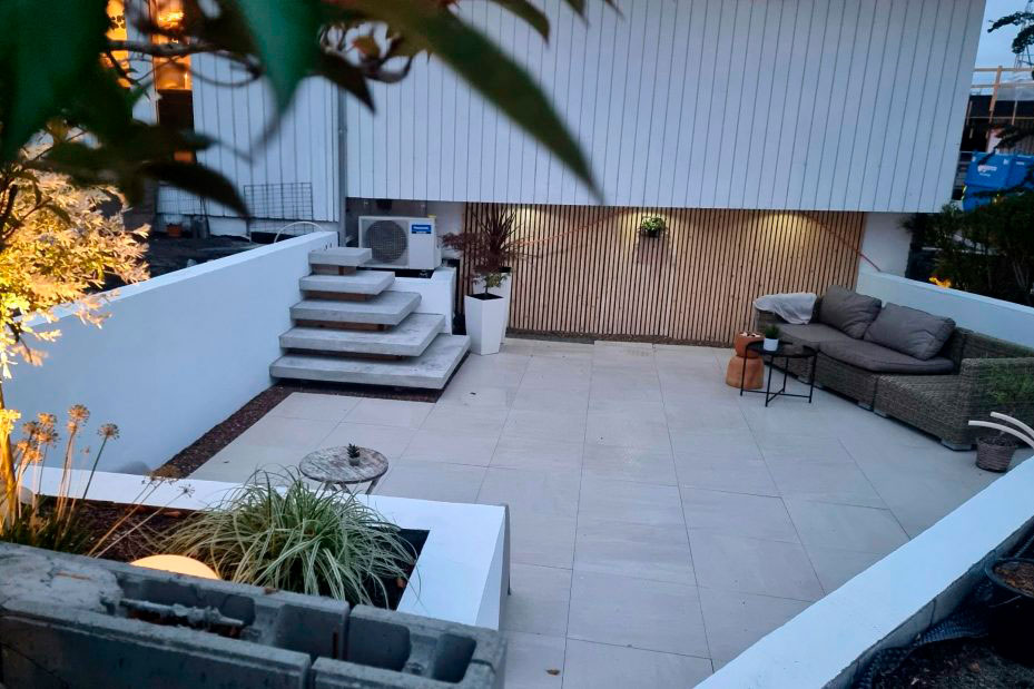 Det nedsenkede uteområdet er vakkert anlagt. Vi er imponert over den flotte svevende trappen, og listverket og belegningsarbeidet med de store hellene er godt utført.