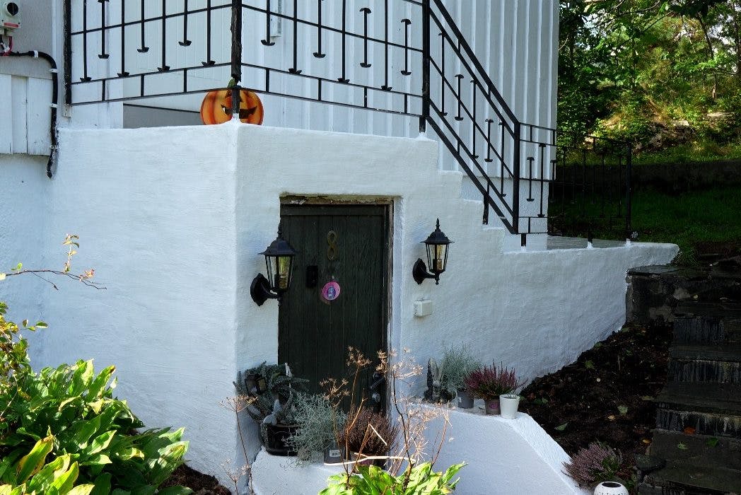 Sprekker og hull ble reparert, og til slutt ble hele trappen malt.