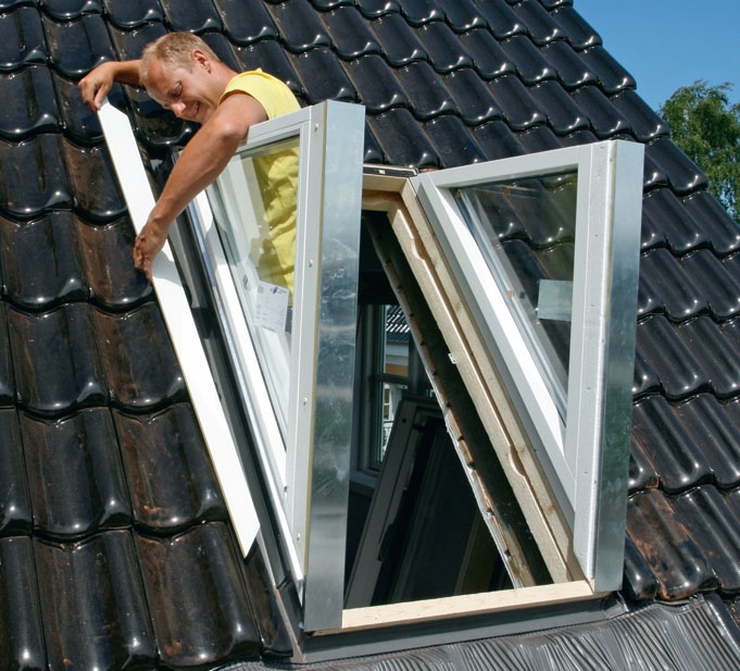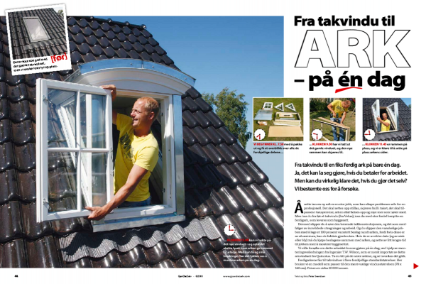 Vinduet på plass - ferdig! Først skilles rammen og karmen. Så plasseres karmen mellom arksidene, slik at sporet i bunnen kan senkes ned over vannbrettet. Deretter skrus karmen fast til sidene med karmskruer, taket skrus fast, og karmen skrus fast til taket via vindusfalsen.