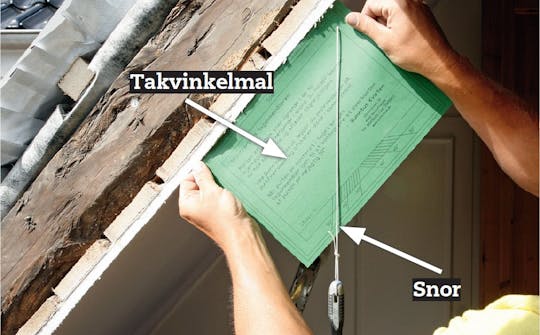 Takvinkelen finner du ved å holde pappmalen som følger med mot skråveggen. Vinkelen leses av ved hjelp av en snor med ballast (her en skrutrekker), som settes fast i hjørnet.