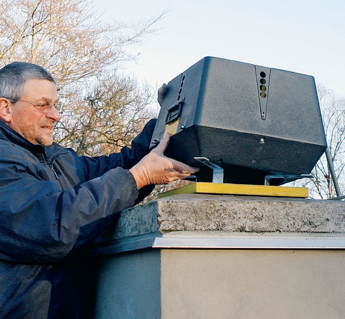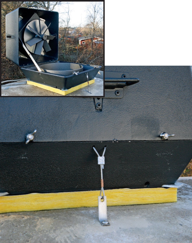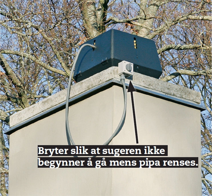 Legg mineralullspakningen over skorsteinen med aluminiumsfolien oppover. Røyksugeren settes oppå slik at vinkelbeina stikker ned i pipa.