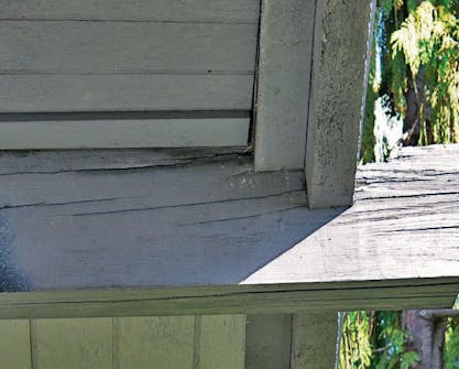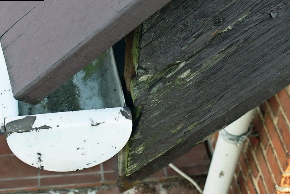 Bordene under takutstikket er beskyttet av taket og av vindskier og kantbord. Men hvis denne beskyttelsen svikter på grunn av manglende vedlikehold, kommer det inn vann her, slik at bordene på undersiden kan råtne.