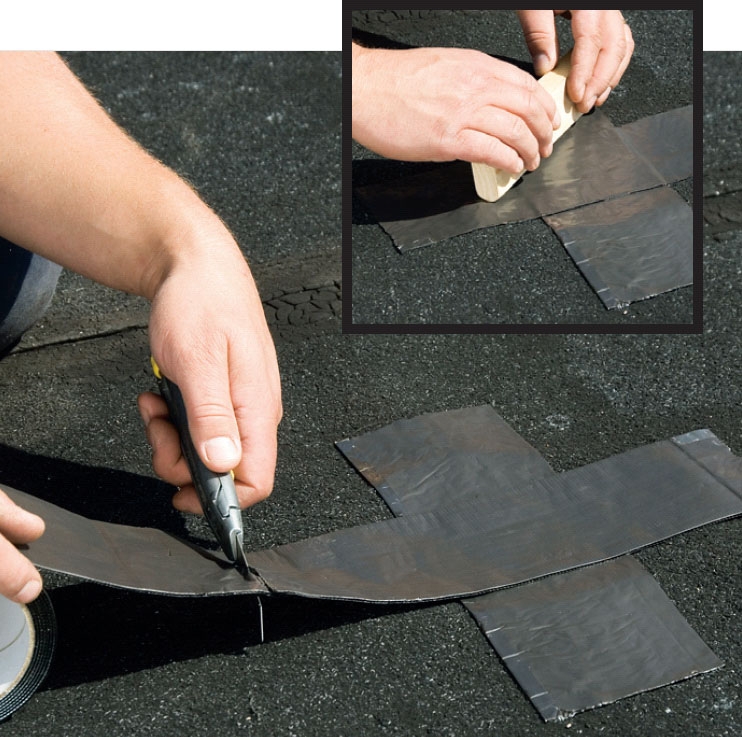Sjekk om det er blærer i takpappen. Ei blære vil briste før eller siden, så den må repareres. Skjær et kryss i blæra, men skjær bare gjennom overpappen, ikke underlagspappen. Ved store blærer kan du bruke en metallinjal slik at snittet blir rett.