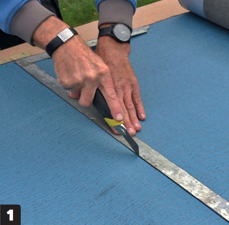 Lengdene skjæres til i riktig lengde. Takbelegg er ganske tungt, så i stedet for å fomle med hele rullen, skjæres lengden av noen centimeter for lange. En lang vinkel og en kraftig hobbykniv er gode hjelpemidler.