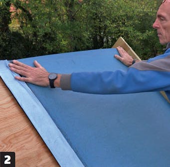 Begynn i øverste, innerste hjørne med å fjerne folien. Folien sitter ganske godt fast, så løft lengden opp og trekk forsiktig. Legg belegget fra innsiden og ut på toppen. Vent med å fjerne folien ved takfoten.