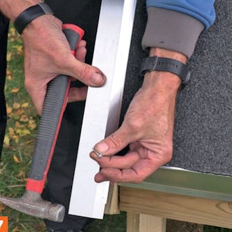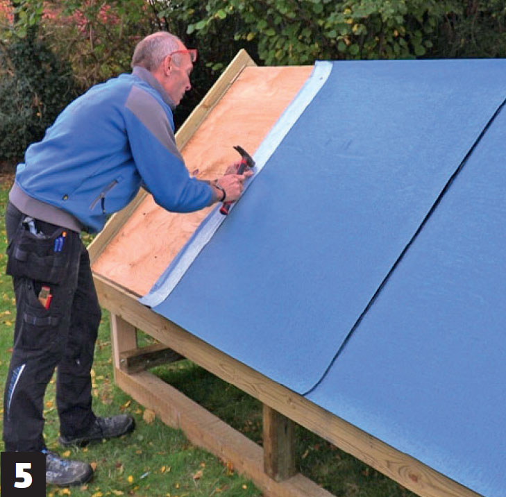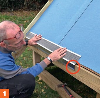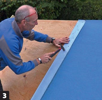 Start med å spikre overbelegget fast på vindskien. Merk at vi denne gangen begynner på motsatt side. På denne måten vil ikke overlappene ligge oppå overlappene i underbelegget.
