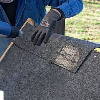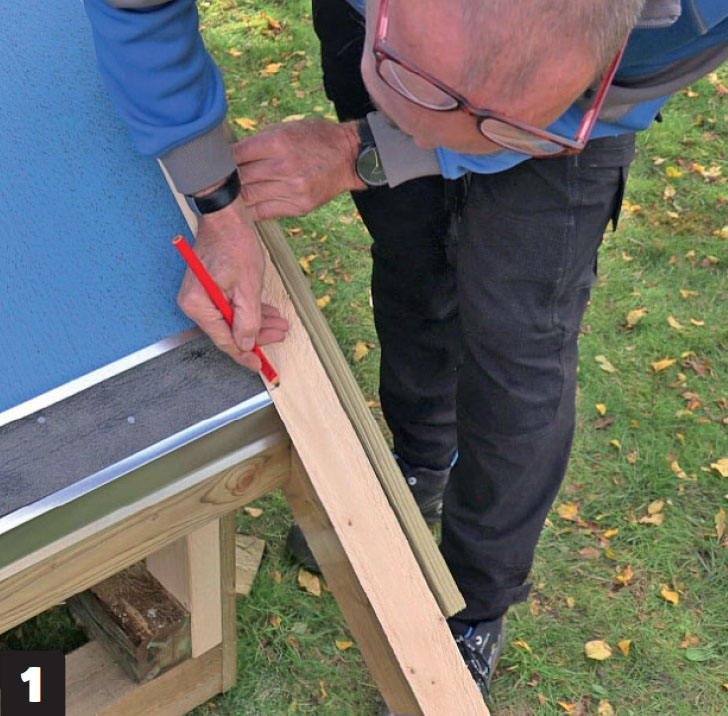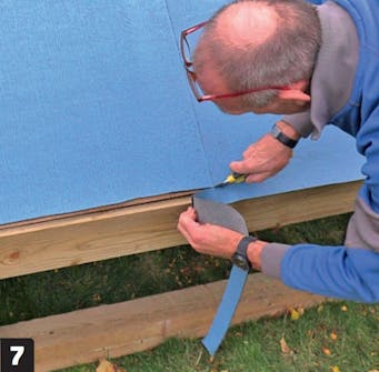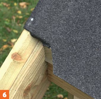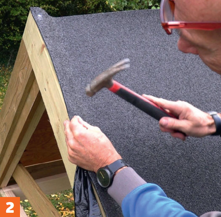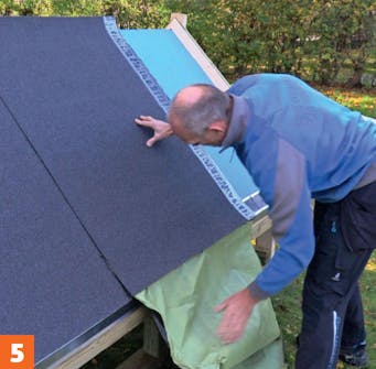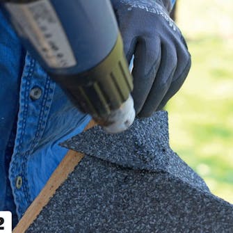 Vær nøye nede mellom vindskien og takfoten. Det krever litt finesse å justere belegget der det går over trekantlisten nederst. Klipp til og fest med asfaltlim og en spiker.