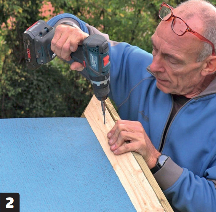Listen skrus fast. Lange skruer skrus vinkelrett inn i undertaket gjennom trekantlisten og underbelegget. Kontroller vinkelen på toppen med listens makker før du skrur. Det er irriterende å måtte gjøre det på nytt.