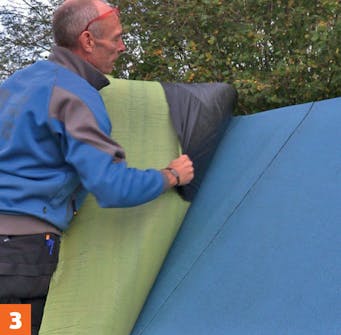 Fjern resten av plastfolien og trykk fast belegget over hele flaten. Fortsett med de neste lengdene, og tilpass den siste lengden når den er festet på toppen av vindskien.
