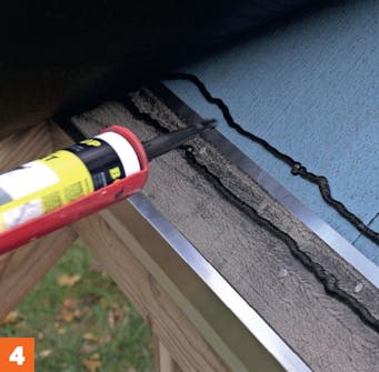 Legg asfaltlim på takfotbeslaget. To til tre striper asfaltlim påføres asfaltlaget på takfotbeslaget, før den siste plastfolien trekkes av overbelegget.
