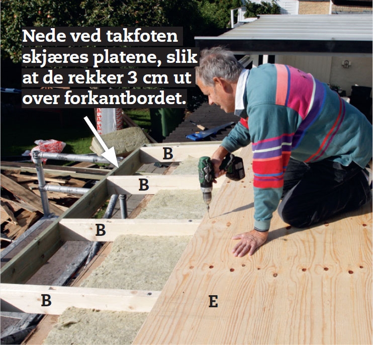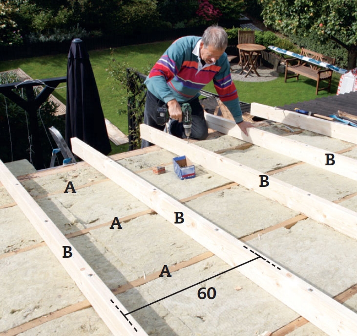 Et nytt lag sperrer (B) skrus fast oppå de gamle sperrene (A), etter at vi har fjernet de gamle takplatene og de råteskadede kryssf nérplatene under dem. De nye sperrene setter vi med en avstand på 60 cm, målt fra senter til senter.