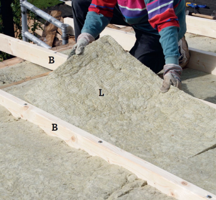 Så legger vi mer isolasjon (L) i taket. De to lagene sperrer ligger på kryss, så vi må arbeide i to etapper. Først fyller vi opp til overkanten av de gamle (A). Så legger vi et nytt lag mellom de nye (B), men ikke mer enn at det er 5 cm luft over.