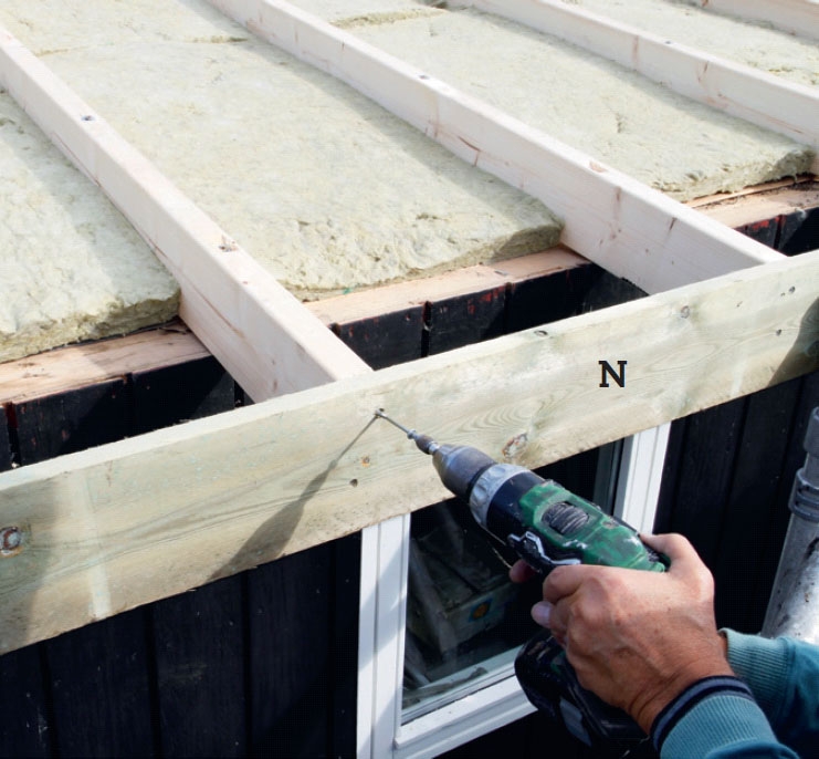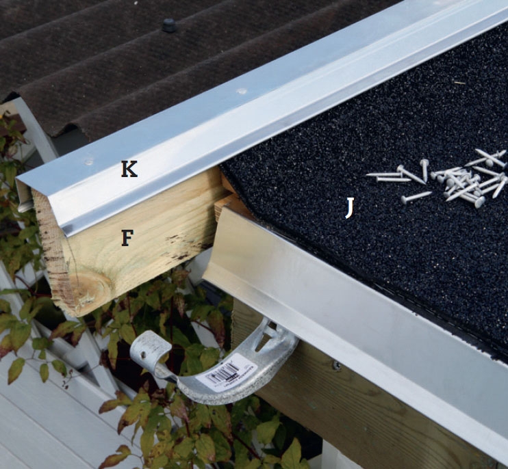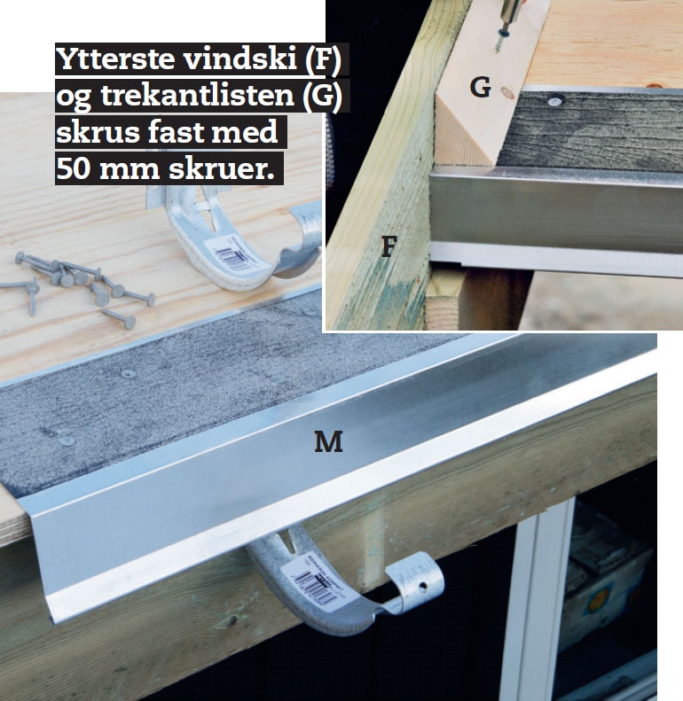 Ved takfoten skrur vi rennekroker på forkantbordet. De fordeles jevnt, med maksimalt 90 cm mellom dem, med et fall på 2 mm per meter. Langs hele kanten festes takfotbeslaget (M) med pappspiker. Ytterste vindski (F) og trekantlist (G) skrus på.