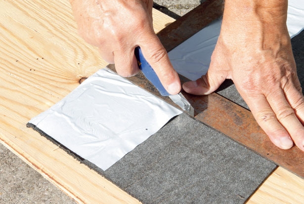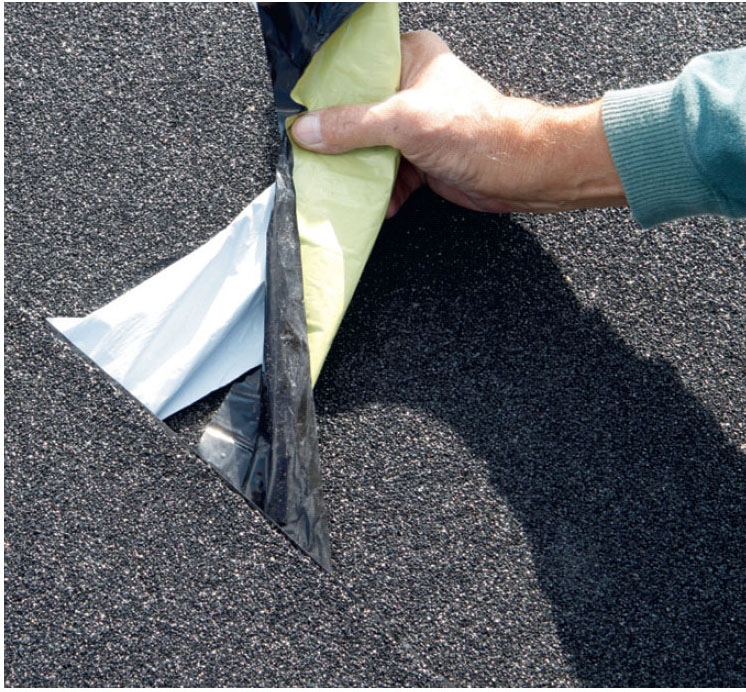 Fortsett med de to siste kantene på første lengde. Ved takfoten skjærer du et skrått snitt i overlappingen, trykker ut to striper taklim på beslaget og presser lengden ned over det. Trekk av folien på langsiden og krysspikre kanten i klebeflaten.
