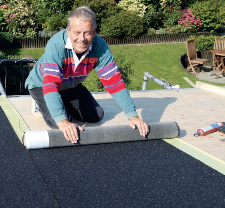 Så er det tid for å legge belegget. Begynn til høyre, sett nedenfra, og rull ut første lengde slik at du har en klebende kant på undersiden ved vindskien. Spikre lengden i kryss langs takryggen med spiker for hver 6 cm. Lim lengden til vindskien.