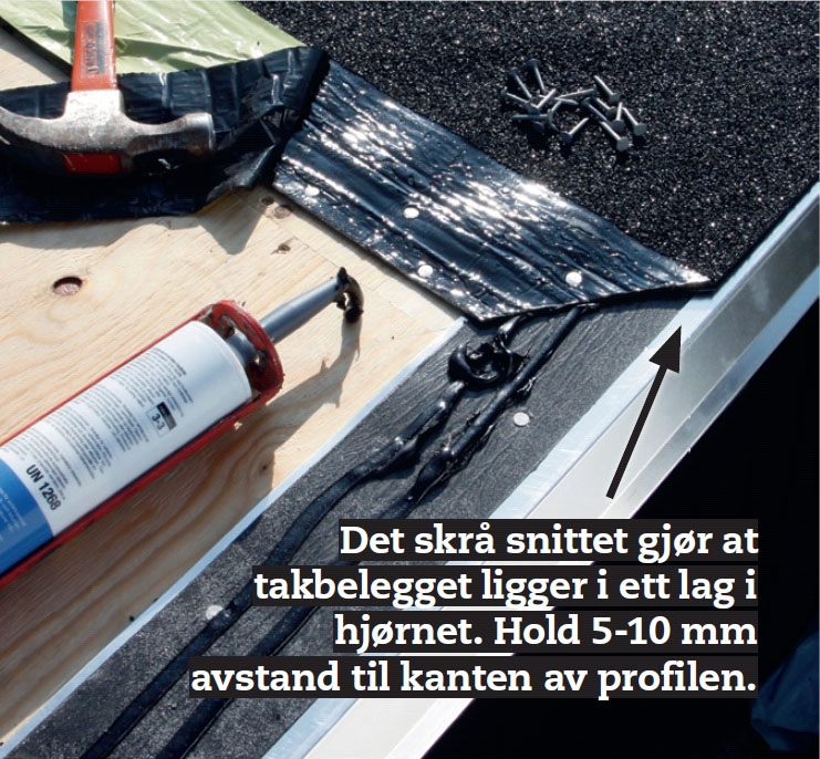 Ute i sidene skrur vi først det ytterste vindskibordet utenpå det innerste, forskjøvet oppover, slik at takbelegget kan fortsette opp langs vindskiene, og skjøten mellom belegg og tre dekkes av et beslag oppå vindskiene.