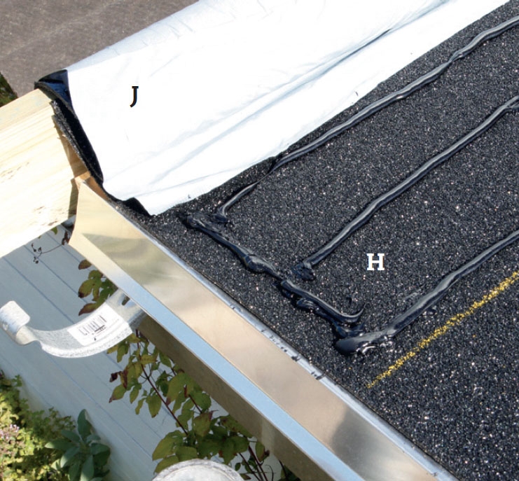 I begge sider sikres taket ekstra med en stripe hellimt belegg (J), etter at det første laget er spikret i kanten. Trekk folien halvt til side på den smale strimmelen, og spikre den blottede kanten fast på vindskien. Trekk en krittstrek langs kanten.