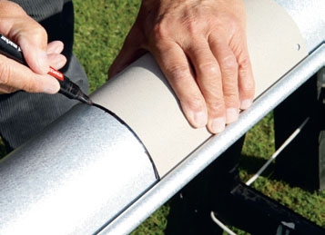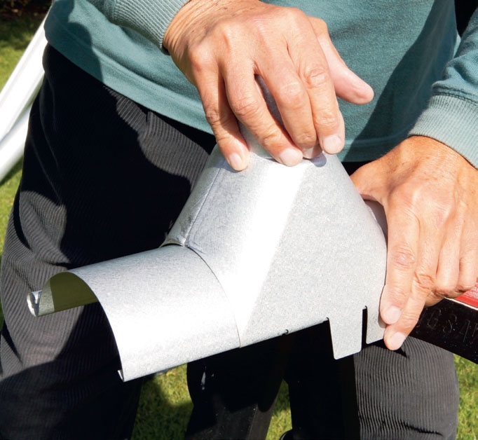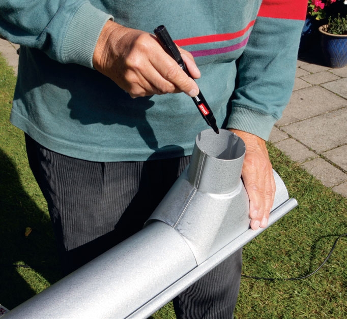 Hullet i bunnen av takrennen tegner du gjennom tutstykket, slik at du sager det riktig - helst rett over nedløpet. Tutstykket stikkes inn i tagrennens fals og vippes på plass. Dermed kan du merke opp for hullet med en sprittusj.