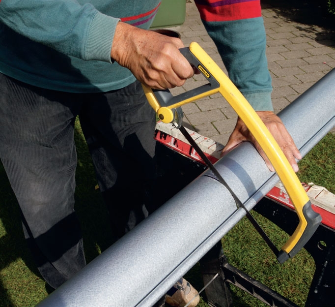 Takrennen kappes i ønsket lengde med en vanlig baufil med fintannet blad. Du skal ikke skjære i verken renner eller rør med vinkelsliper; metallet blir så varmt at galvaniseringen ødelegges permanent, og takrennene ruster.