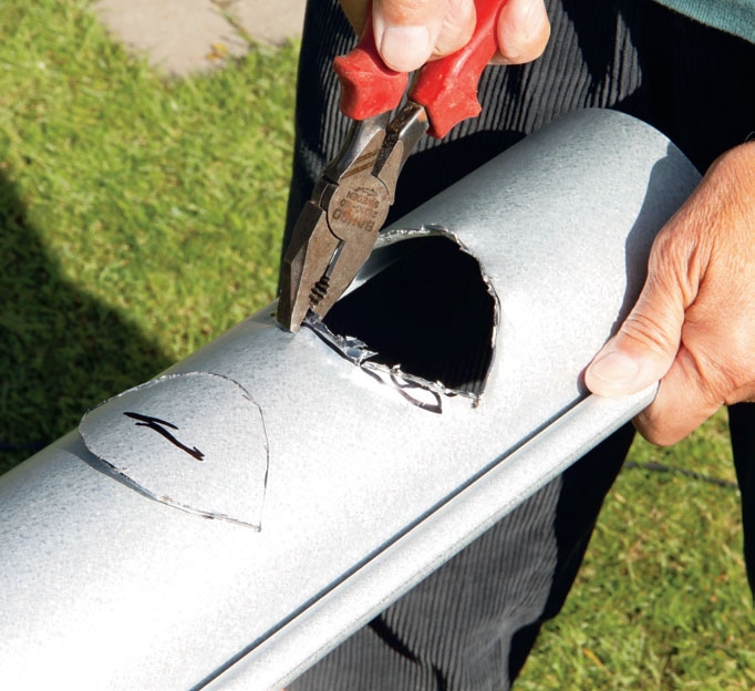 Du skjærer hullet i takrennen med to skrå snitt, ett fra hver side. Også her bruker du baufilen. Med en tang bøyer du de ytterste 5 mm av kanten ut, slik at vann ikke vil renne ut av rennens underside, men ned i nedløpsrøret.