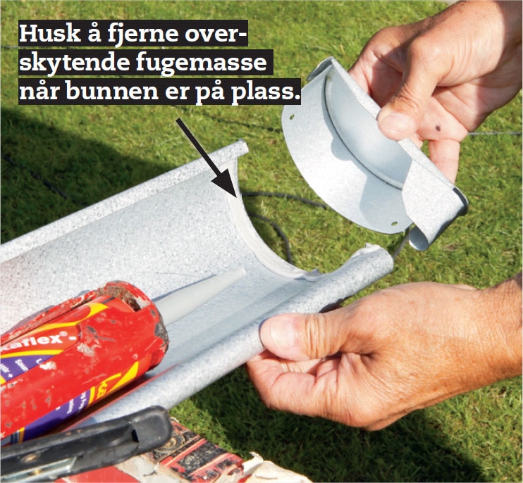 Rennen lukkes med endestykker. Legg en stripe fugemasse innvendig i takrennen, langs endekanten. Dytt endestykket inn i falsen på rennens forkant, press den ned i fugemassen og lås den ved å vri flikene rundt bakkanten.