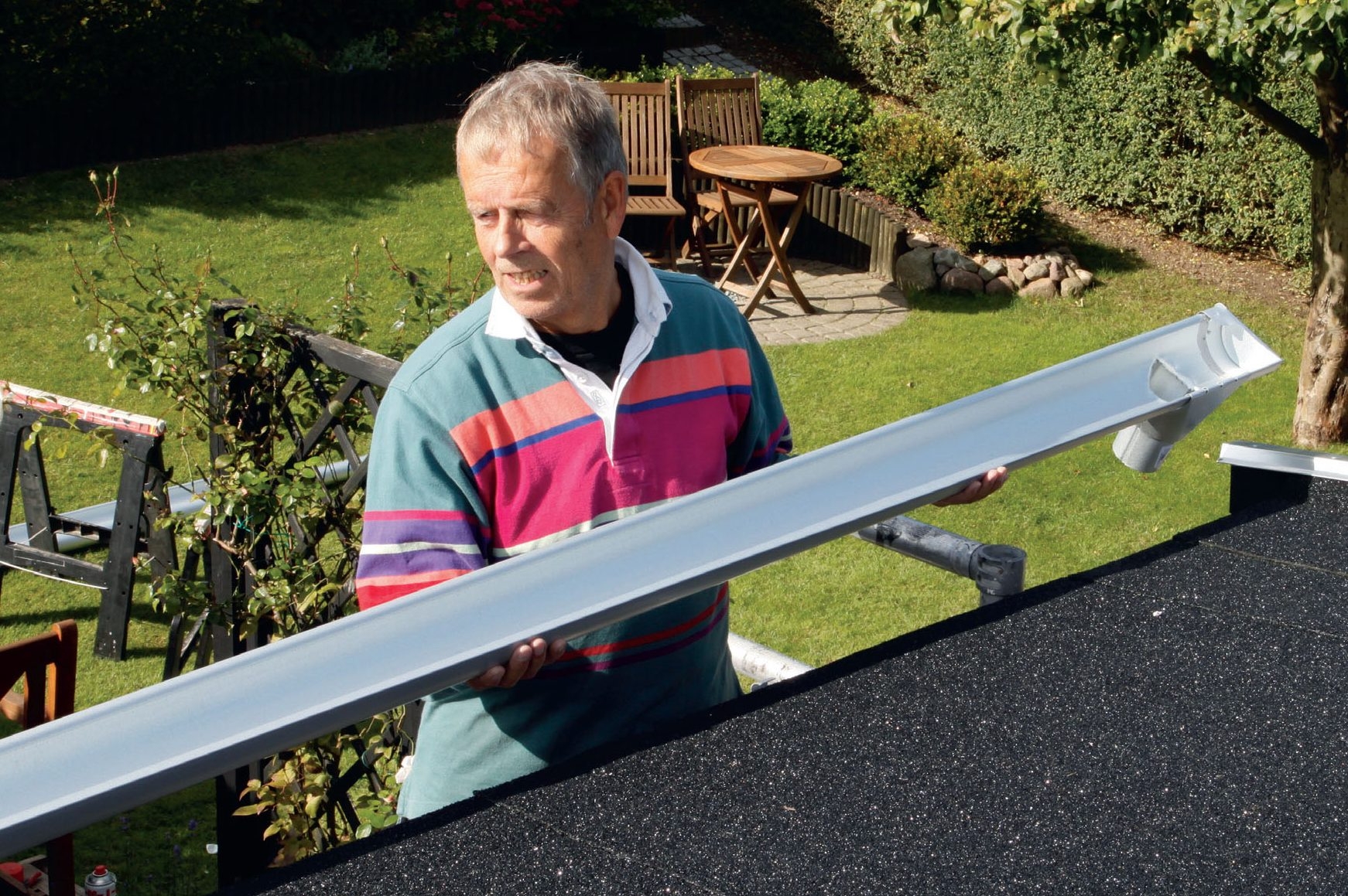 Et godt eksempel er disse galvaniserte ståltakrennene som vi setter opp her. Takrennene er enkle å sette opp, og du trenger absolutt ikke å være håndverker for å oppnå et flott resultat. Du skjærer til renner og nedløpsrør med en vanlig baufil, og alt spennes sammen eller skjøtes med en spesiell fugemasse.
