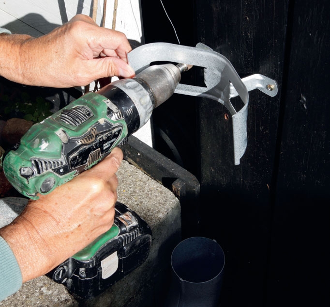 Vi begynner med å sette to rørholdere på veggen, rett nedenfor tutstykket - og ovenfor nedløpet. Bruk alltid to eller flere holdere, slik at røret sitter stabilt.