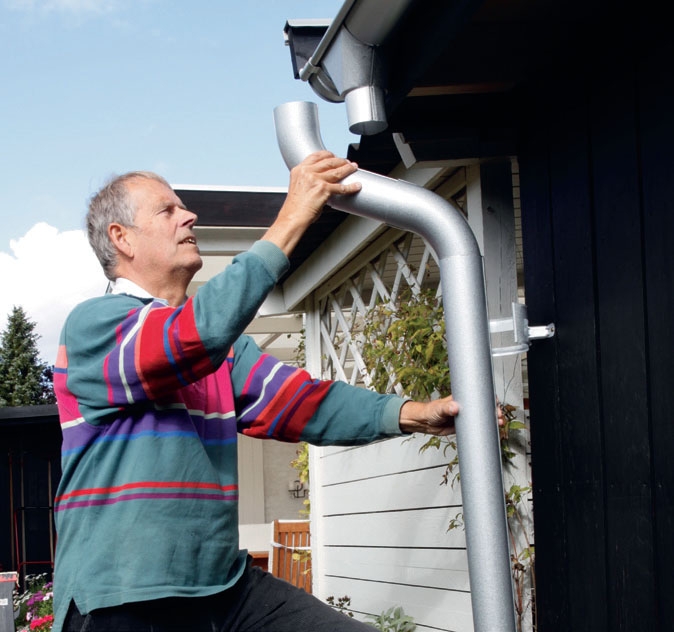 Når takrennen er ferdig og lagt på plass i rennekrokene, mangler du bare å sette opp nedløpsrøret med de bøyingene og skjøtestykkene den trenger.