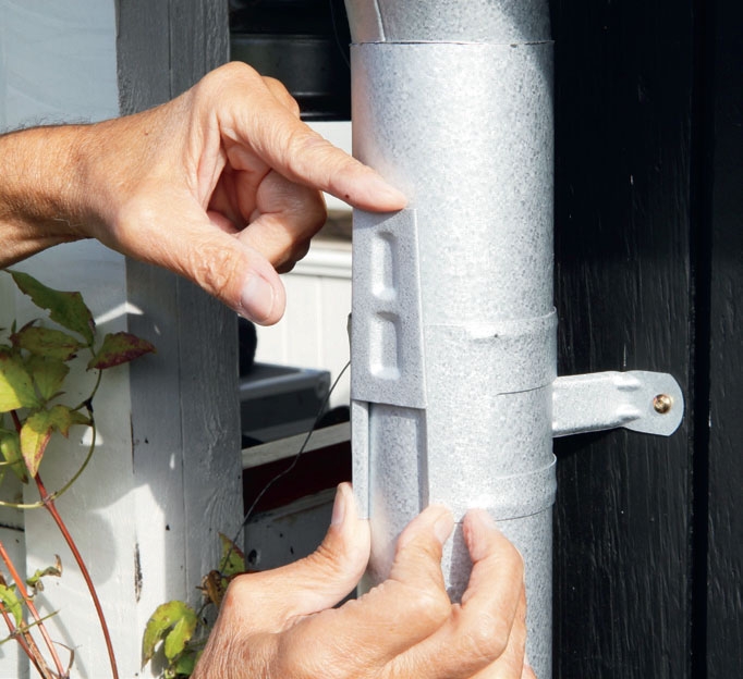 Sett på plass tutstykket på rennen. Trykk det ned mot rennen mens du presser flikene rundt rennens bakkant - mer skal ikke til.