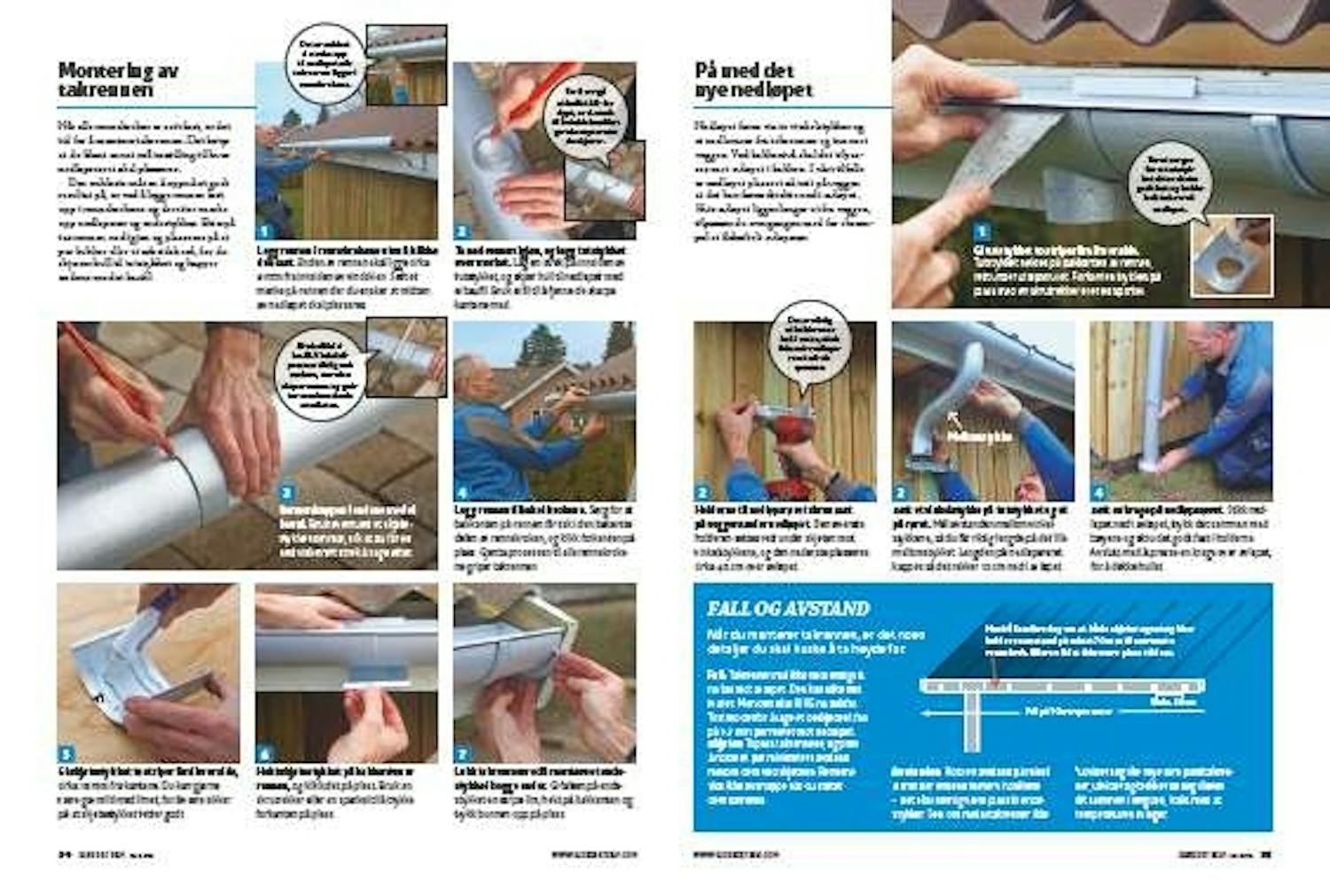 Den enkleste måten å oppnå et godt resultat på, er ved å legge rennen løst opp i rennekrokene og deretter merke opp nedløpsrør og endestykker. Etterpå tas rennen ned igjen og plasseres på et par bukker eller et arbeidsbord, før du skjærer hull til tutstykket og kapper endene med ei baufil.