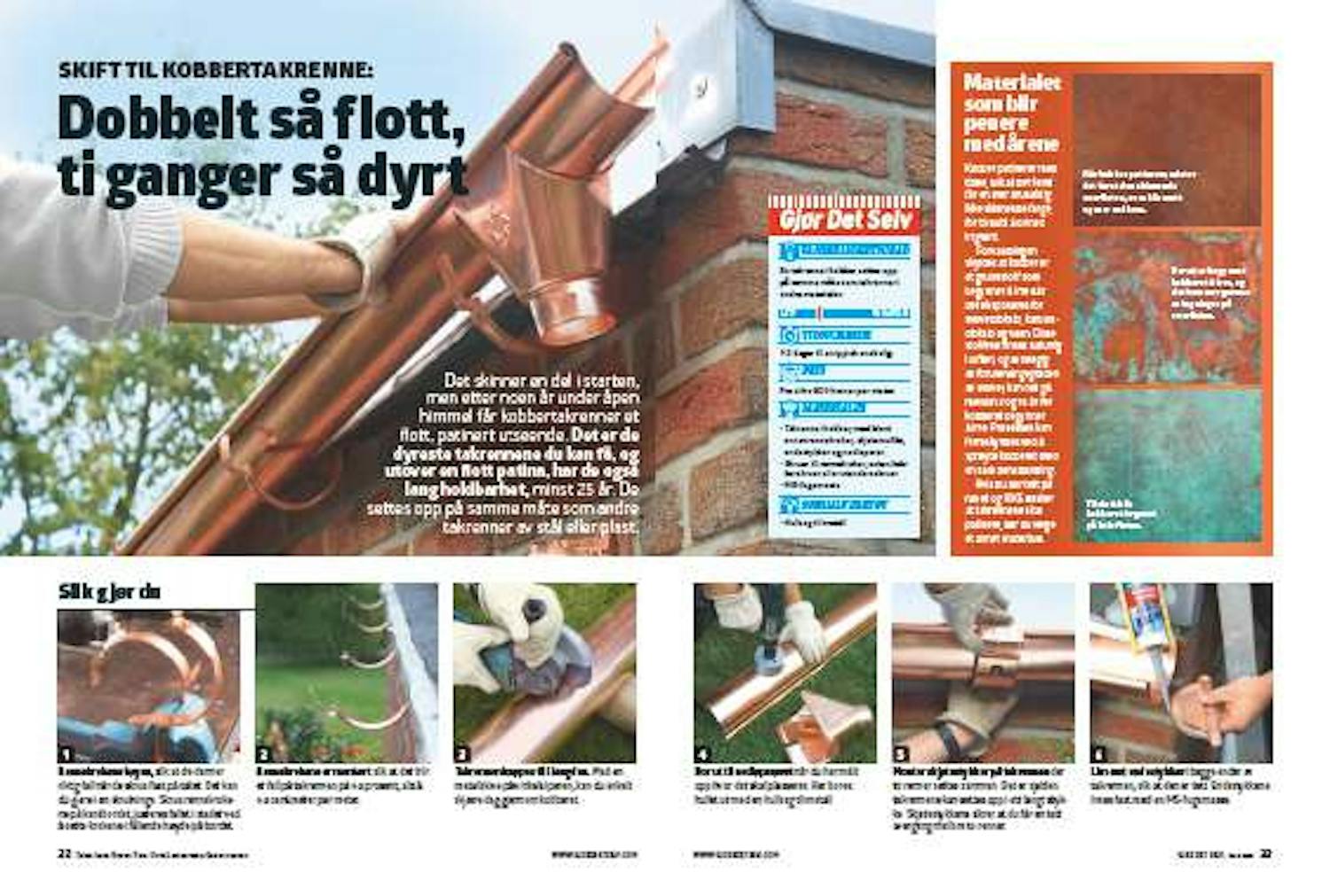 En takrenne i kobber settes opp på samme måte som takrenner i andre materialer.