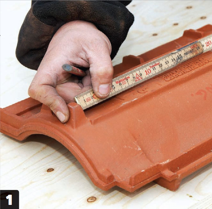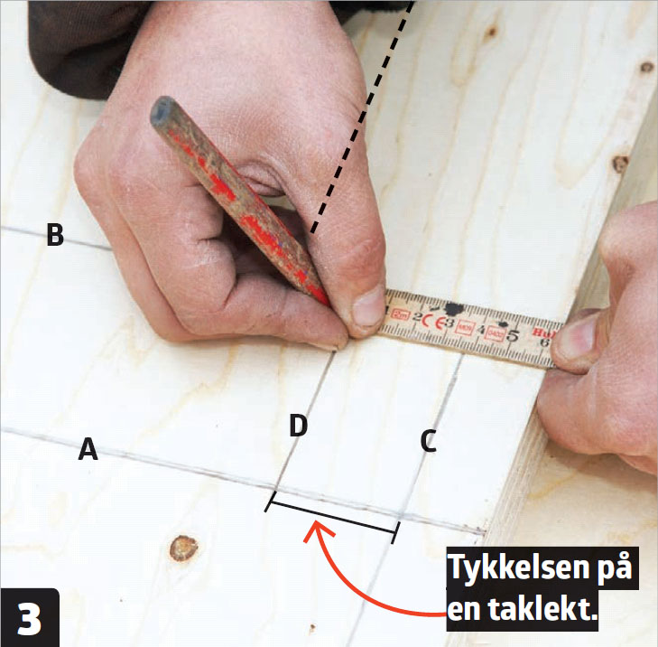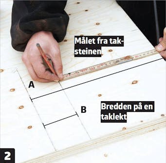 Avsett målet du fant på en finérplate slik: Målet settes langs kanten, og en strek (A) slås vinkelrett inn på platen. Deretter slår du en strek (B) parallelt med den første i en avstand tilsvarerende taklektbredden.