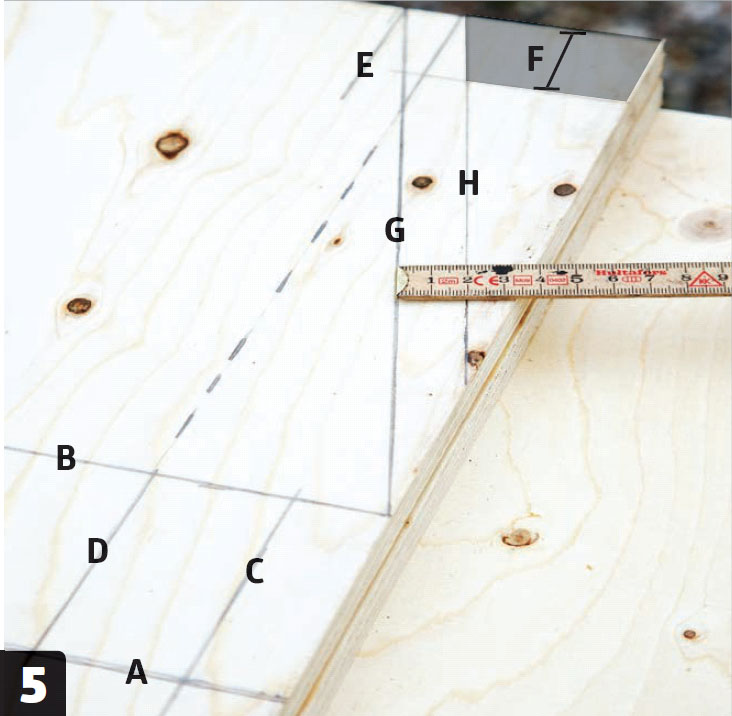 Nå slår du to parallelle streker (G) og (H) som vist på tegningen. Det grå feltet i hjørnet viser profilen som lekten skal skjæres i. Overfør vinkelen til sirkelsagen, og splitt lekten på langs.
