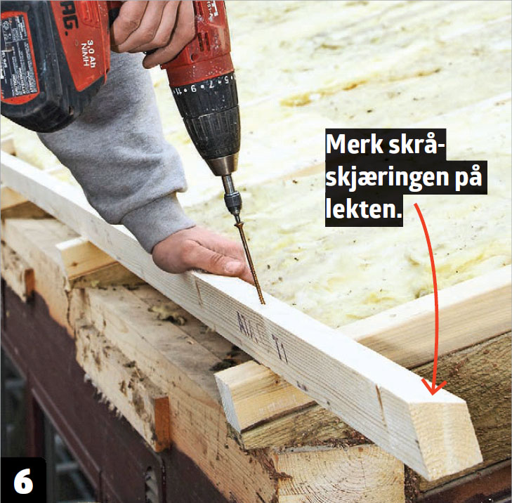 Skru den tilpassede lekten på taksperrene. Lekten skrus på så langt ute på sperrene som mulig. Deretter kan takfotplatene legges på.