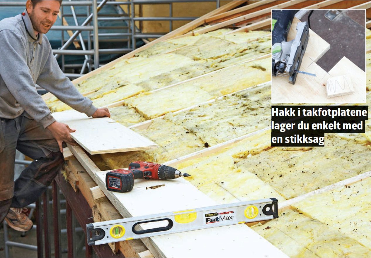 Skru fast takfotplatene. Bruk 25 mm kryssfinér i 30 cm brede lengder, og sag hakk slik at platene ikke stikker over sperrene og danner samlingssted for kondensvann.