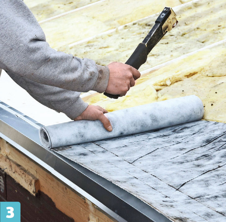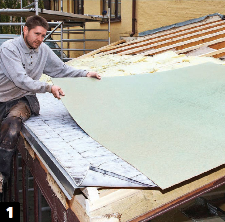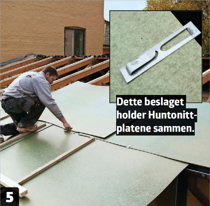 Så skal undertaket av huntonitt legges på. Huntonitt er laget av presset og impregnert trefiber, som leder vekk vann og fukt. Platene leder eventuelt vann ned til takfoten og ned i takrennen.