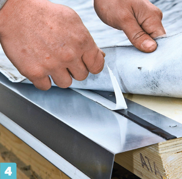 Når fotplaten er skrudd fast, skal du forsikre deg om at eventuelt vann som havner under taksteinene ledes vekk fra takkonstruksjonen, og ikke havner et sted inne mellom takfot og undertak. Det gjør du med en kombinasjon av en vinkelformet aluminiumsskinne - et fotblikk eller takfotbeslag - og et egnet takbelegg. Her brukes et produkt som heter Haloten, som er en fiberduk tettet med tjære. Sammen leder dette vann fra undertaket ned i takrennen. Selve monteringen viser vi her.