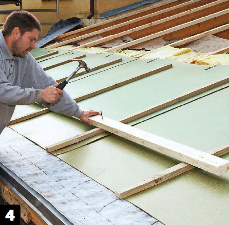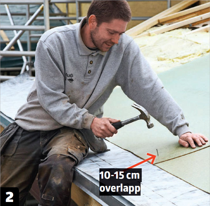 Legg på neste plate med 10-15 cm overlapp, og gi den et par spiker så den ikke sklir unna. Spikerne skal ned i de underliggende sperrene.