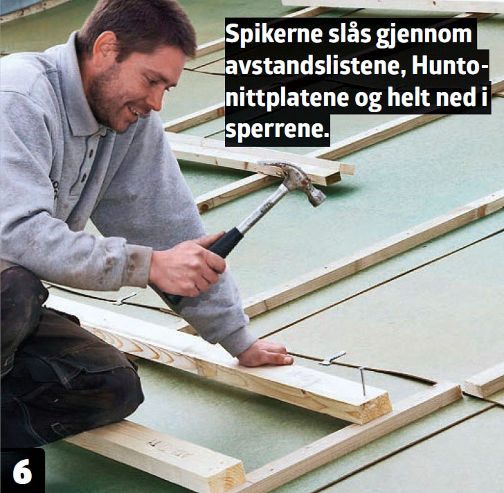 Spikre sløyfer på Huntonittplatene og ned i sperrene, slik at platene blir holdt fast. Sløyfene følger sperrene og gir ventilasjon mellem takkledningen og undertaket.