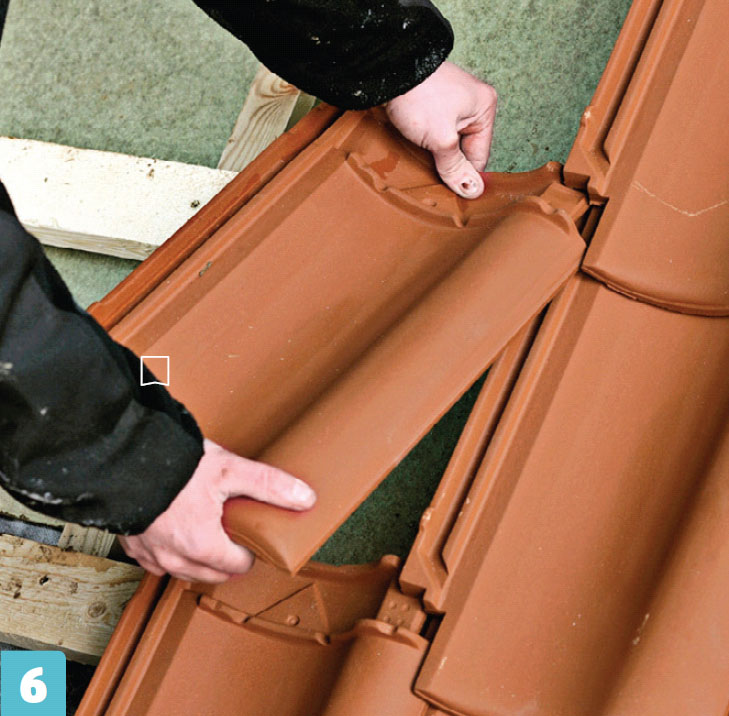 Det er ikke sikkert mønesteinene går opp med bredden på taket. Derfor kan mønebeslagene justeres 3-4 cm; det skal være nok til å få det til å gå opp hvis taket ikke er kortere enn 650 cm, som tilsvarer 14-15 mønestein. Til slutt kan du fylle ut og legge de midterste steinene der du har stått. Her skal du bare binde fast hver annen stein.