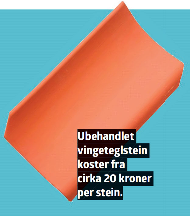 Teglstein koster fra cirka 300 kroner per kvm, avhengig av type. I tillegg kommer kostnader til undertak, lekter, sløyfer, beslag og annet som hører til.
