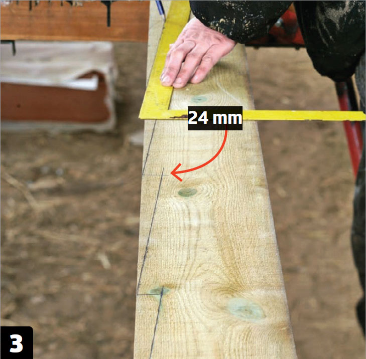Tegn opp hakkene. Ta ned vindskien, og strek opp hakkene nøyaktig. Hvert hakk er 24 mm dypt, og går på skrå fra avmerking til avmerking..
