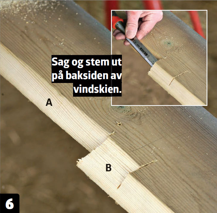 Slik skal vindskibordet se ut fra baksiden. Du kan se det skrå hakket (A) og utstemmingen til knasten (B). Nå gjenstår bare monteringen.
