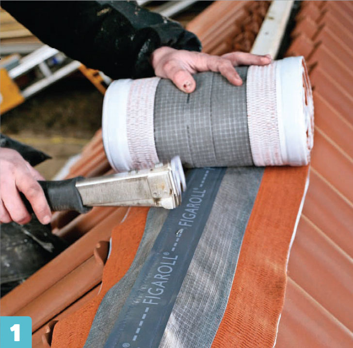 Når sidesteinene og de tre øverste radene med stein er på plass, er det smart å legge mønesteinene. Det er fordi du fortsatt kan stå på lektene som ennå ikke er dekket av stein, slik at du slipper å skli rundt på glatte takstein. Mønebjelken er allerede lagt, nå skal det kun en inndekking til, som dels skal sørge for en toppventilasjon av taket, og dels holde snøføyk ute. Inndekkingen lages av et mønebånd og tettes med butyl-bånd på øverste rad med takstein. Når mønebåndet sitter, er det bare å feste mønesteinene.