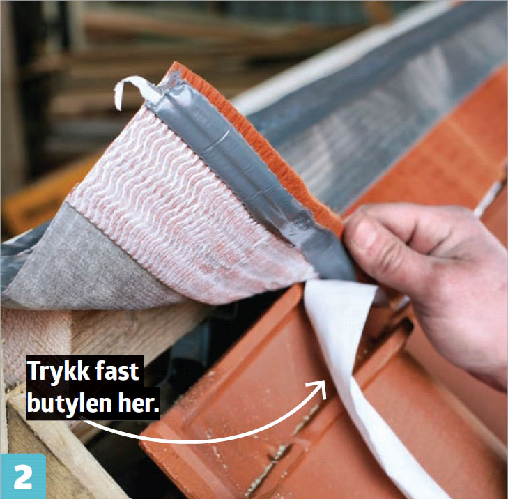 Fjern baksidefolien, og trykk butylbåndet fast mot toppen av øverste rekke med stein. Det er veldig klebrig, og vil holde seg slik i mange år fremover.