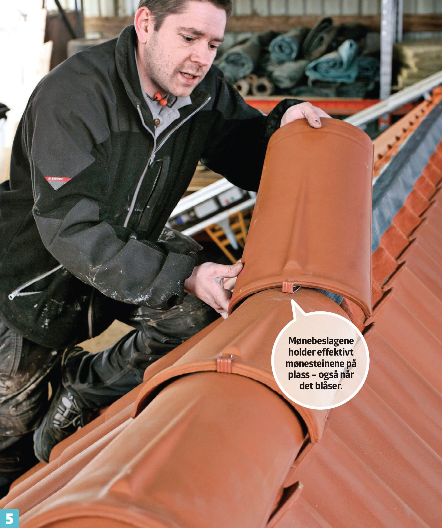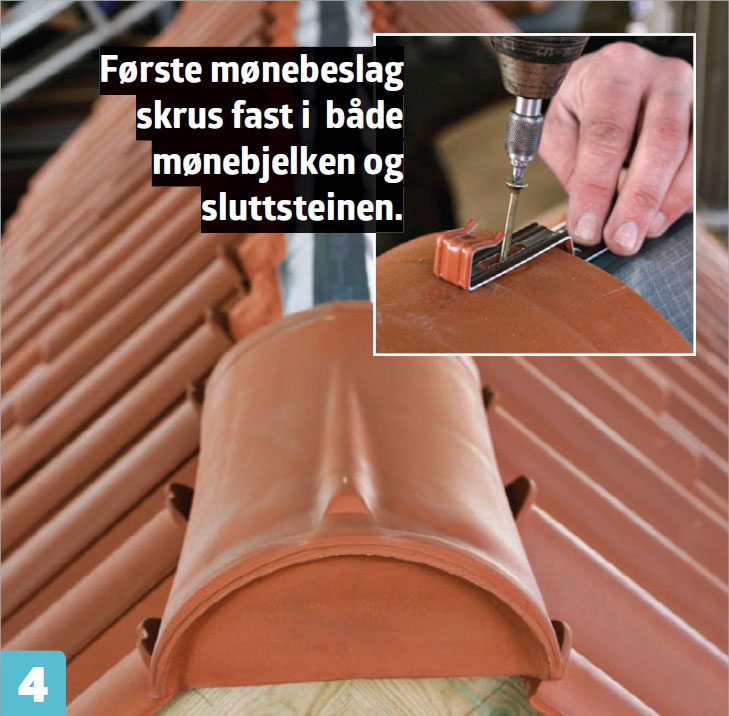 Legg på den ytterste mønesteinen, og skru den fast gjennom mønebeslaget. Fest også beslaget i mønebjelken før du legger på de øvrige mønesteinene og fester dem med beslag.